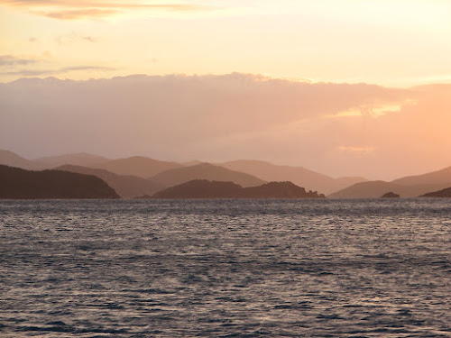 We had arrived at Ginger in a squall so it was fitting that another arrived as we were hauling up the anchor. Rounding the westerly point and entering the Drake Channel it was just like someone turned back on the pleasure sail; the high seas and rain instantly disappeared and we headed up to Spanish Town on Virgin Gorda. We were happy that we had reefed the mainsail as the winds climbed up over 20 knots and with genny reefed as well, Mowzer happily skipped along at 7-8 knots! We were enjoying it so much and making such good way we carried on up to Long Bay where we tucked into the anchorage just off a lovely isolated white sand beach fringed by reef and turquoise waters. Just five other cruisers in the anchorage - no mooring balls and a beautiful westerly view over the island of Tortola - I anticipate another good sunset tonight.